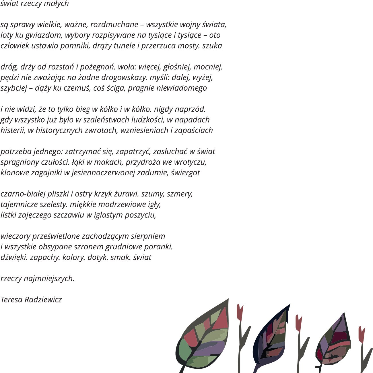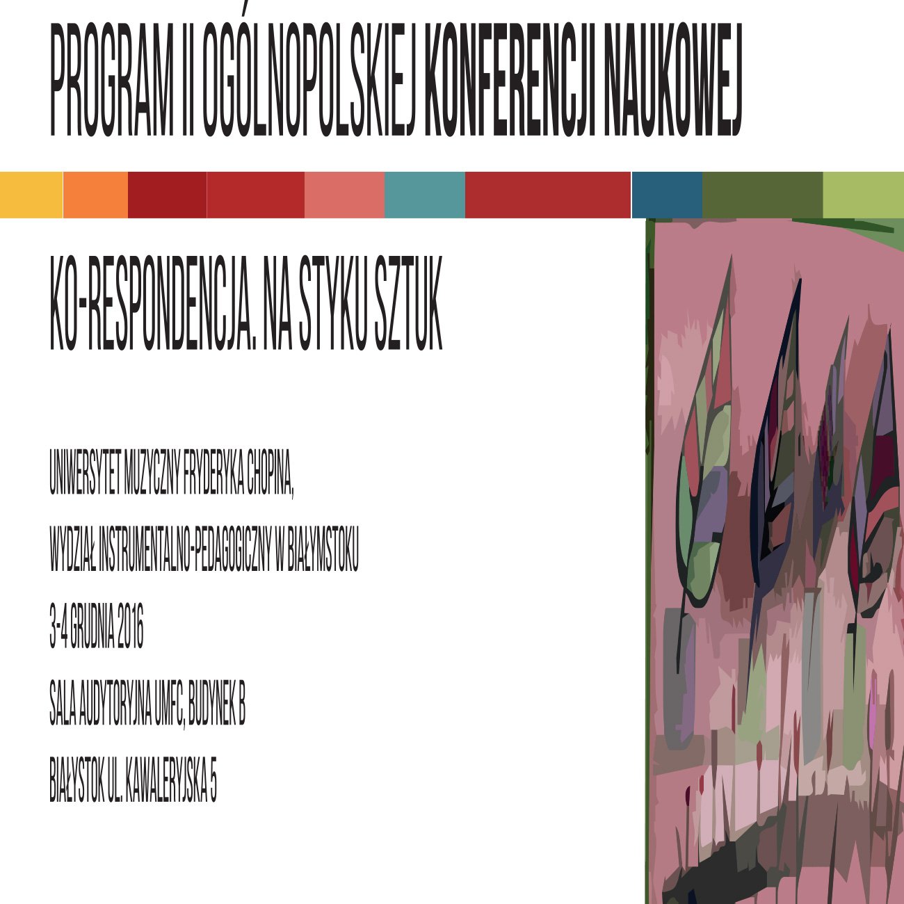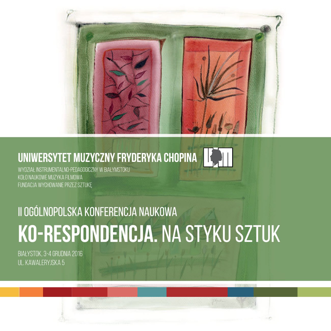 Szanowni Państwo, Wydział Instrumentalno-Pedagogiczny w Białymstoku Uniwersytetu Muzycznego Fryderyka Chopina zaprasza w dniach 3-4 grudnia 2016 roku do udziału w II Ogólnopolskiej Konferencji Naukowej KO-RESPONDENCJA. Na styku sztuk. Celem konferencji jest zastanowienie się nad szeroko pojętymi kontekstami sztuki, jej wielowymiarowością i wzajemnym przenikaniem się różnych dyscyplin. Próbując rozwinąć te zagadnienia chcielibyśmy, aby konferencja miała charakter interdyscyplinarny i stała się miejscem artystyczno-naukowego dialogu. Od najdawniejszych bowiem czasów sztuki artystyczne wzajemnie się przenikały, łączyły się z nauką, wpływały na życie codzienne, a codzienna rzeczywistość wywierała wpływ na kształty artystyczne. Przykłady interferencji sztuk odnajdujemy w starożytnych sztukach synkretycznych, barokowej operze, przesiąkniętej literaturą muzyce romantycznej, malarskim impresjonizmie czy sztukach wizualnych XX wieku.