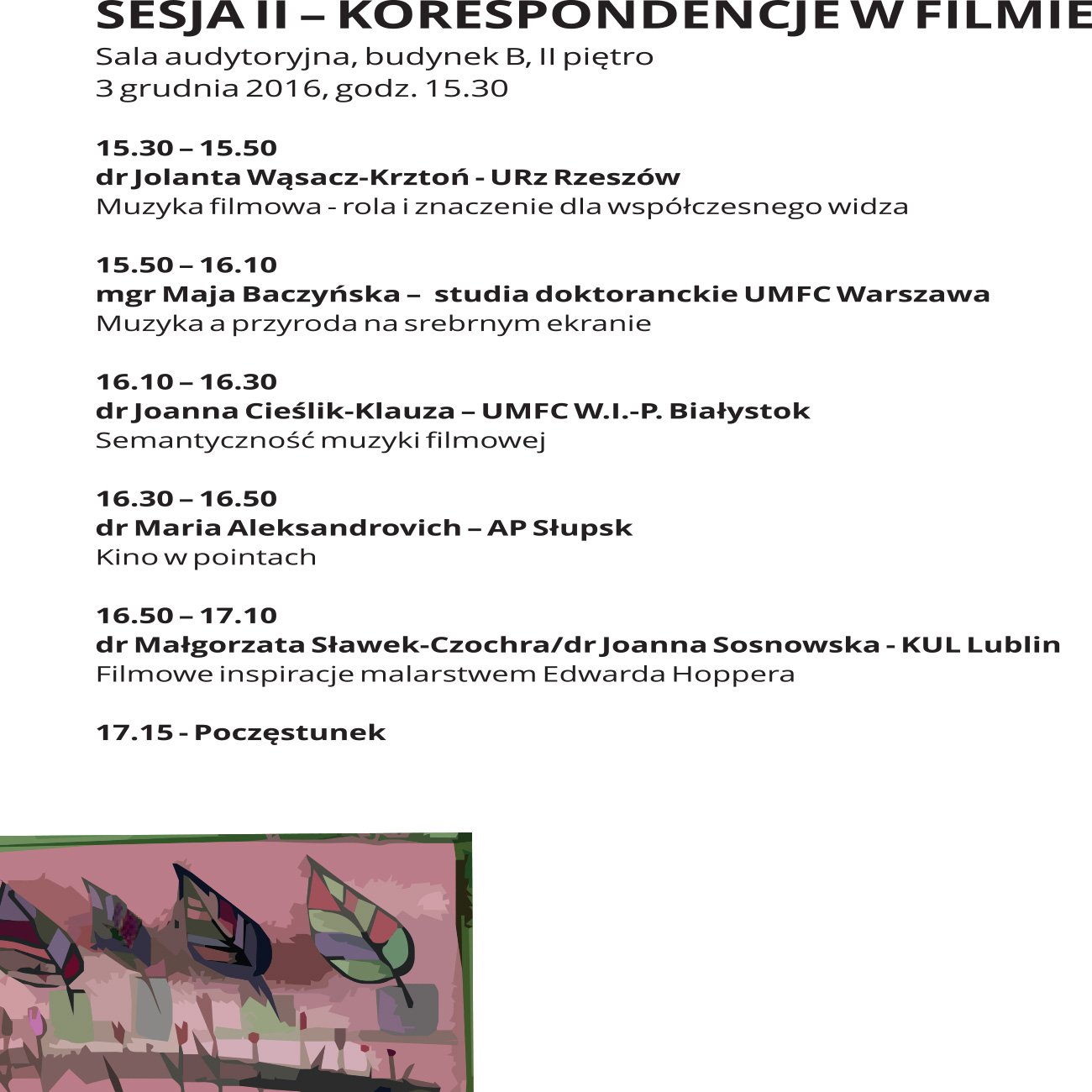 - 3-4.12.2016 – II Ogólnopolska Konferencja Naukowa KO-RESPONDENCJA. Na styku sztuk, oraz ostateczny termin przesłania pełnego tekstu wystąpienia w formie elektronicznej.