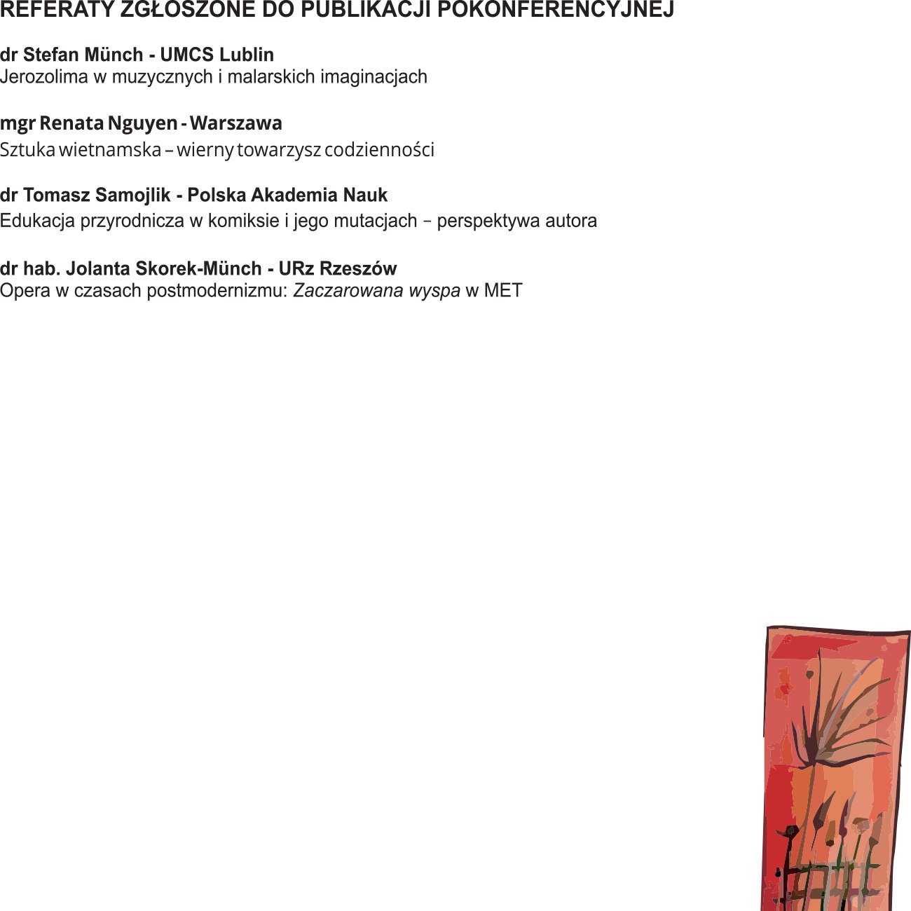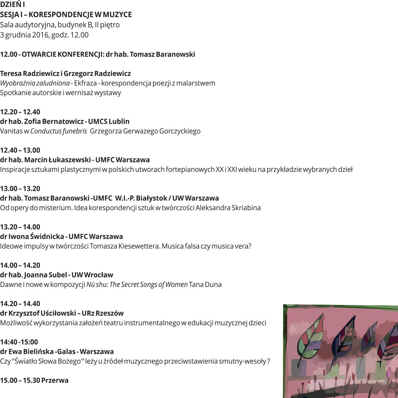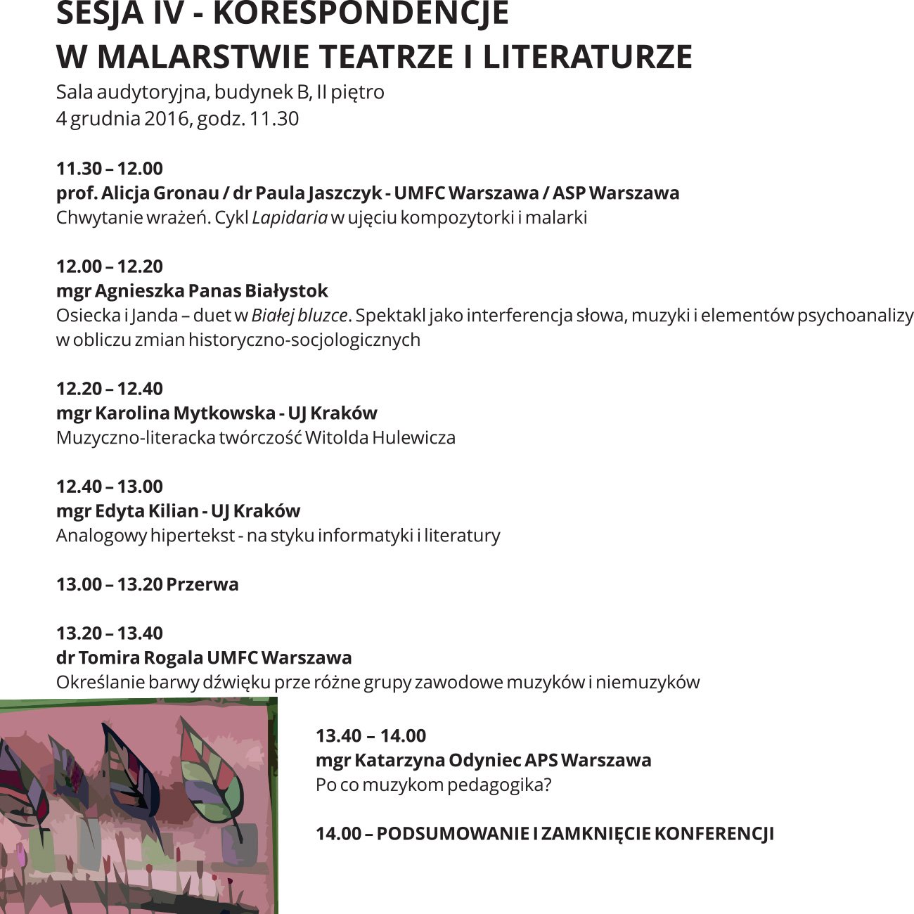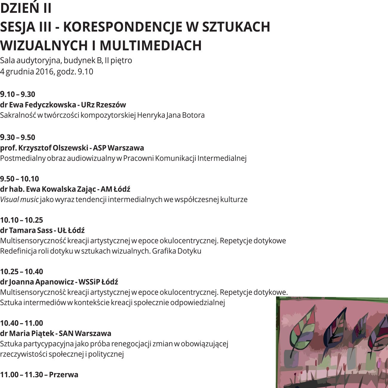 - 3-4.12.2016 – II Ogólnopolska Konferencja Naukowa KO-RESPONDENCJA. Na styku sztuk, oraz ostateczny termin przesłania pełnego tekstu wystąpienia w formie elektronicznej.